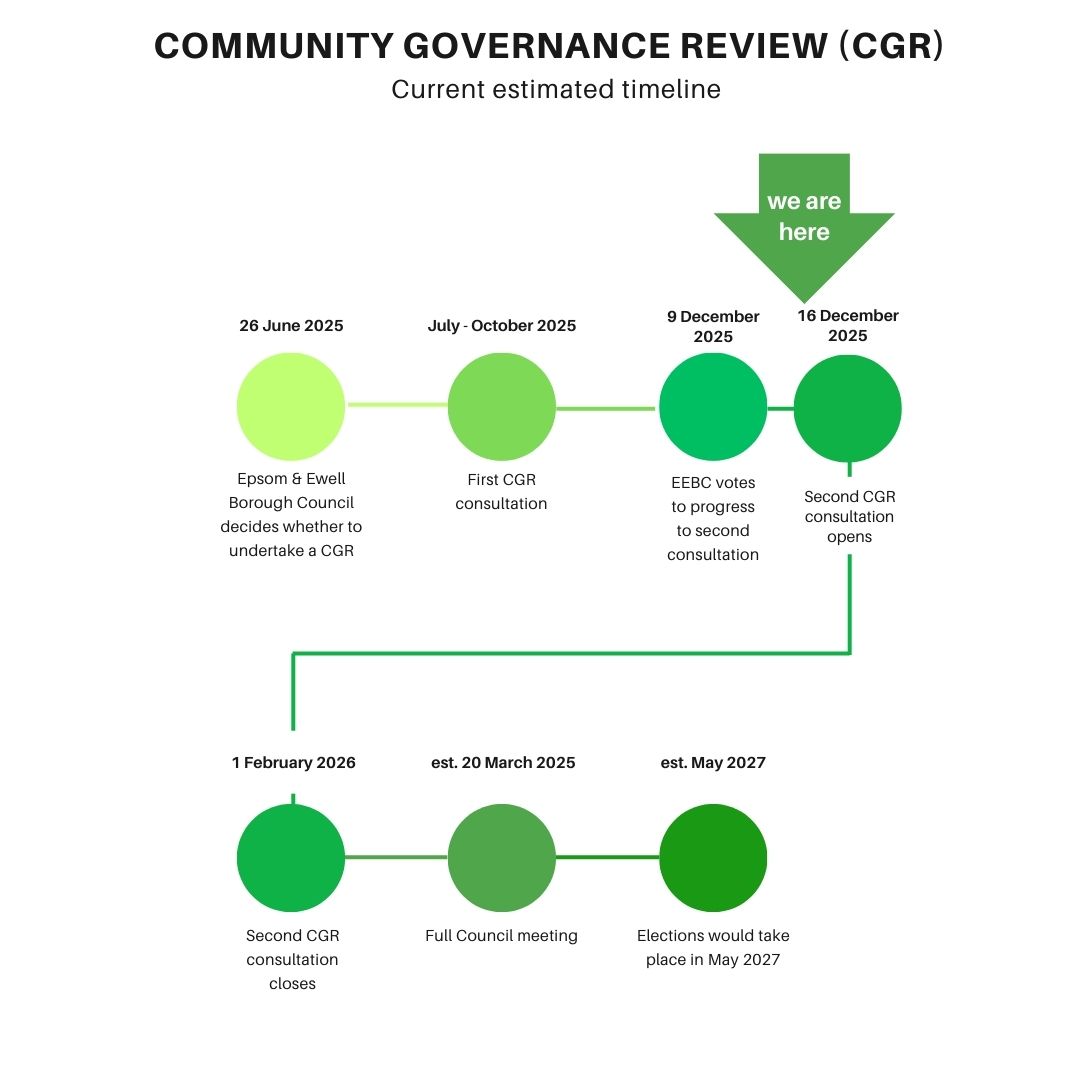 On 9 December, Epsom & Ewell Borough Council voted to proceed to the second stage of its community governance review (CGR). The next CGR consultation will ask residents if they want two new community councils - Epsom Community Council and Ewell Community Council. Together, the new councils would cover the same area as the current borough of Epsom & Ewell.