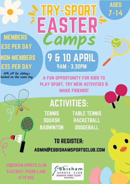The Easter holidays are fast approaching, so if you're looking for activities to keep the kids busy, why not considering booking our Try-Sport Camp on Tuesday 9 & Wednesday 10 April from 9.00am-3.30pm.For those who have not attended our camps previously, Try-Sport camps are an ideal introduction to a variety of different sports for children aged 7-14 years old. They're an enjoyable way for children to start playing sport and feature coaching, games and social activities. Children will learn new sports skills, make friends and grow their confidence!Cost: Ebbisham Members £32 per day/ Non-Members £35 per day10% discount will be applied to one booking when two siblings are registered on the same day.To book a place, please email admin@ebbishamsportsclub.com or visit our website https://ebbisham.mycourts.co.uk/index.asp?sid=435&id=4106 for more information.