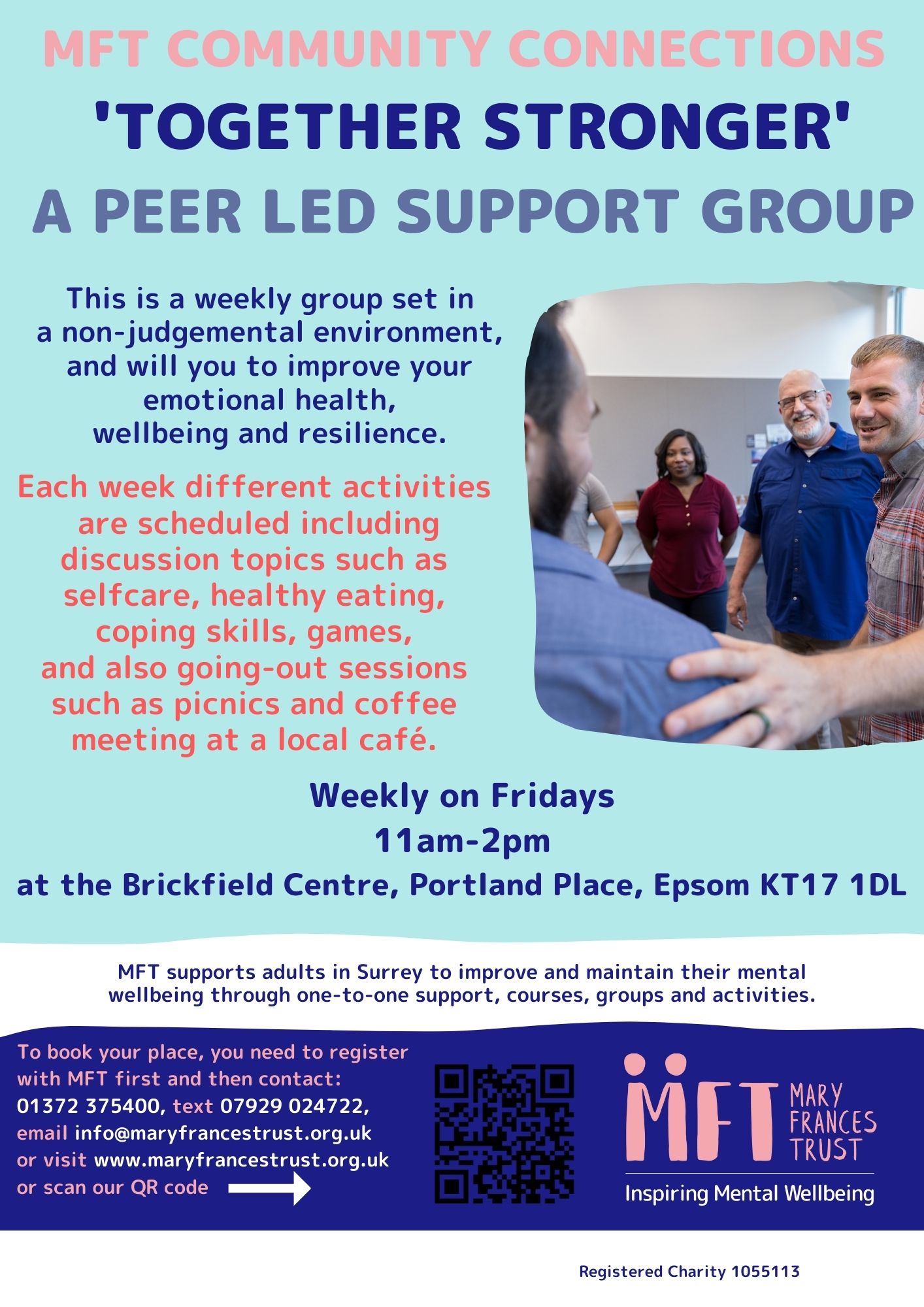 This is a weekly group on a Friday set in a non-judgemental environment and will help you to improve your emotional health, wellbeing and resilience. Each week different activities are scheduled including discussion topics such as self care, healthy eating, coping skills, games and also going-out sessions such as picnics and coffee meetings at a local café.