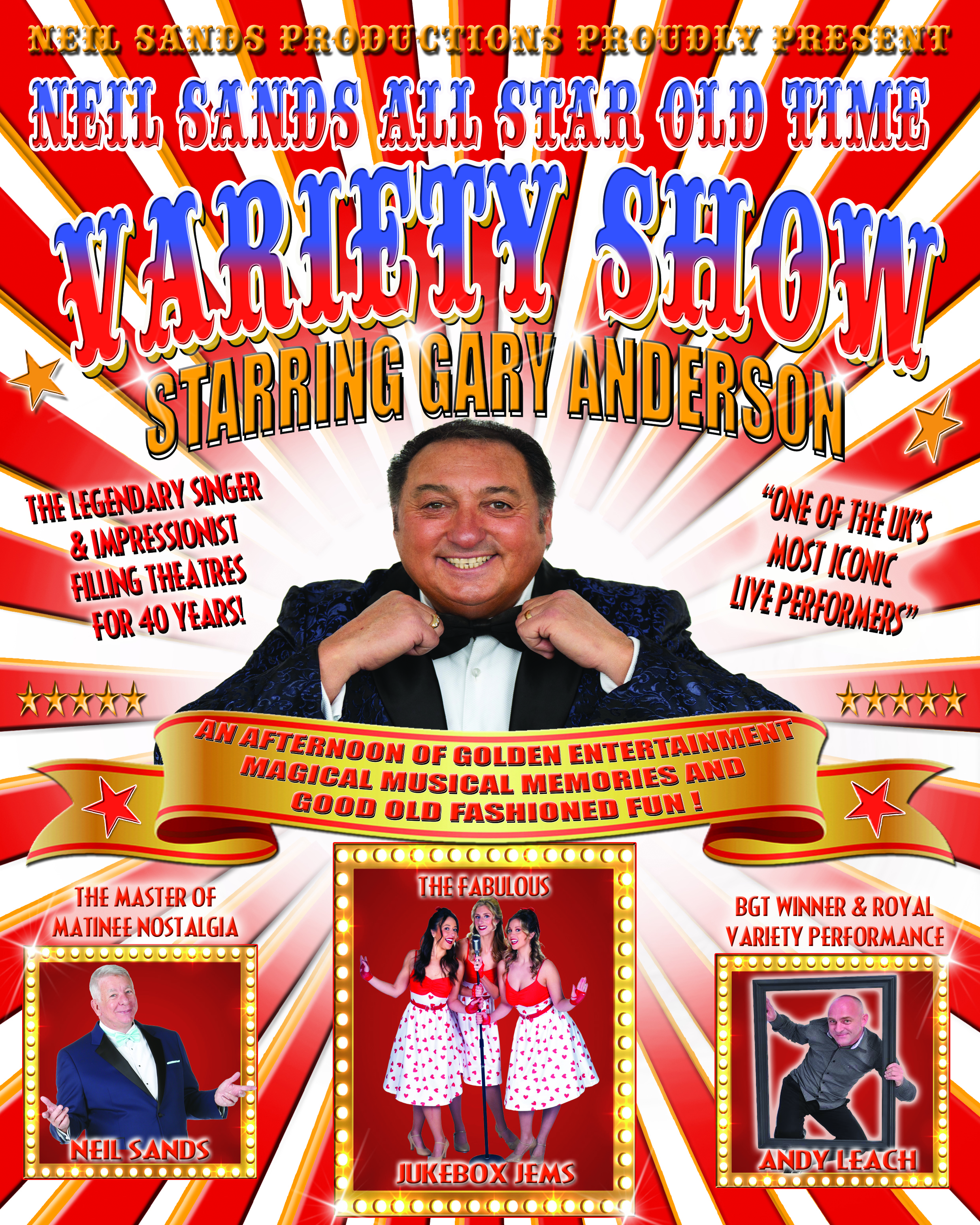 Topping the bill is the sensational Gary Anderson, star of the top touring show That’ll Be The Day, renowned for his brilliant vocal impressions and hilarious comedy. This rare matinee appearance promises to be something truly special.Also appearing are The Fabulous JukeBox Jems, bringing the rock ’n’ roll spirit of the ’50s and ’60s with dazzling harmonies and eye-catching choreography, plus Andy Leach, Royal Variety performer, with his laugh-out-loud comedy magic. Neil Sands All Star Old Time Variety Show | Epsom Playhouse